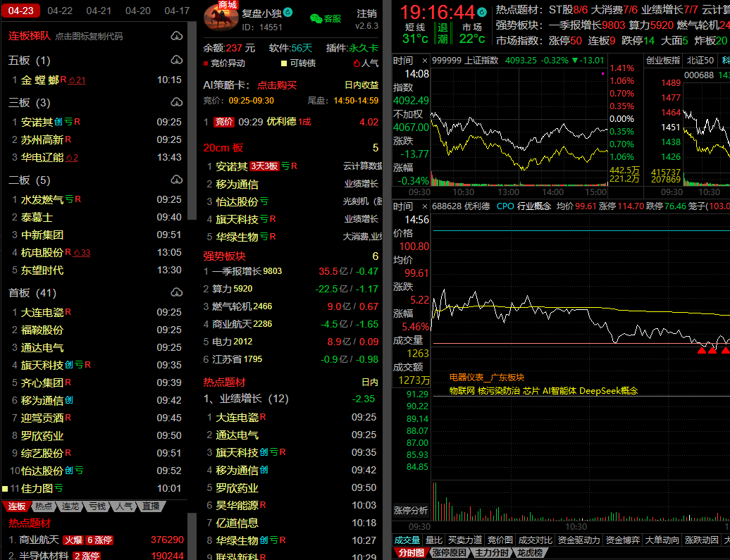【优利德】CPO+20cm强势标+爆量小高开超预期+ 联讯明日上市,符合模式买点,日内+4%中肉,昨日尾盘已经拿了点先手,午后冲高做T,继续观察。