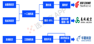 按照业务模式,国内航空公司可以分为全服务航空(干线-三大航、吉祥)、低成本航空(干线-春秋)、支线航空(支线-华夏航空)三种类型。