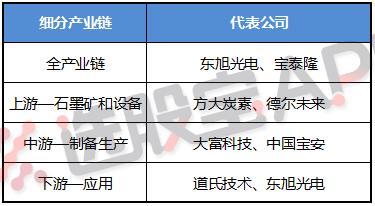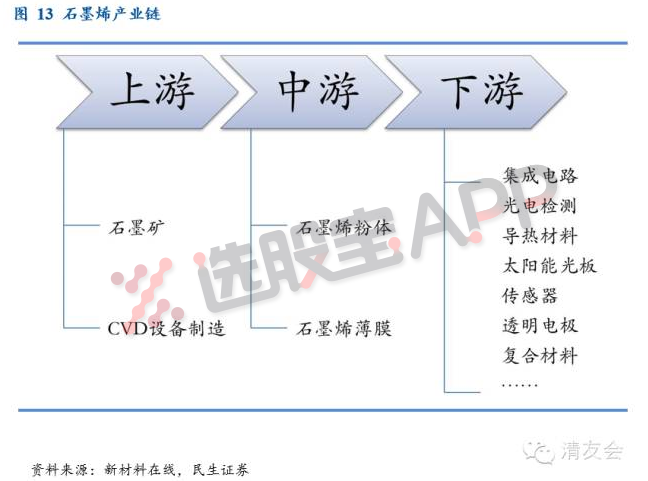 石墨烯属于题材性行业,从整个石墨烯产业来看,主要涉及原料(石墨矿)、设备、生产(包括中间产品)、应用这四个领域,其中石墨烯的生产和应用为产业链上最为核心的两个环节。