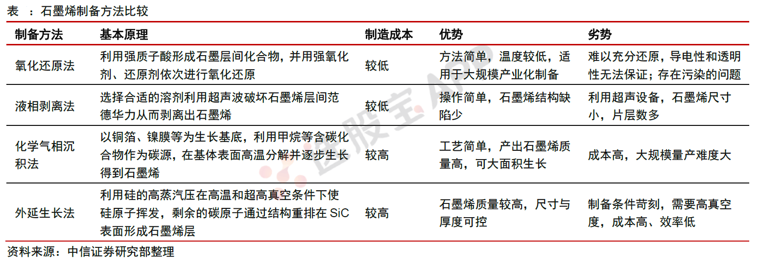 石墨烯产品可以分为薄膜和粉体两类,比较主流的石墨烯制备方法有氧化还原法、化学气相沉积法、液相剥离法和外延生长法,不同制备方法获得的石墨烯在品质和成本上差别较大,相应产品的适用领域也有差异。