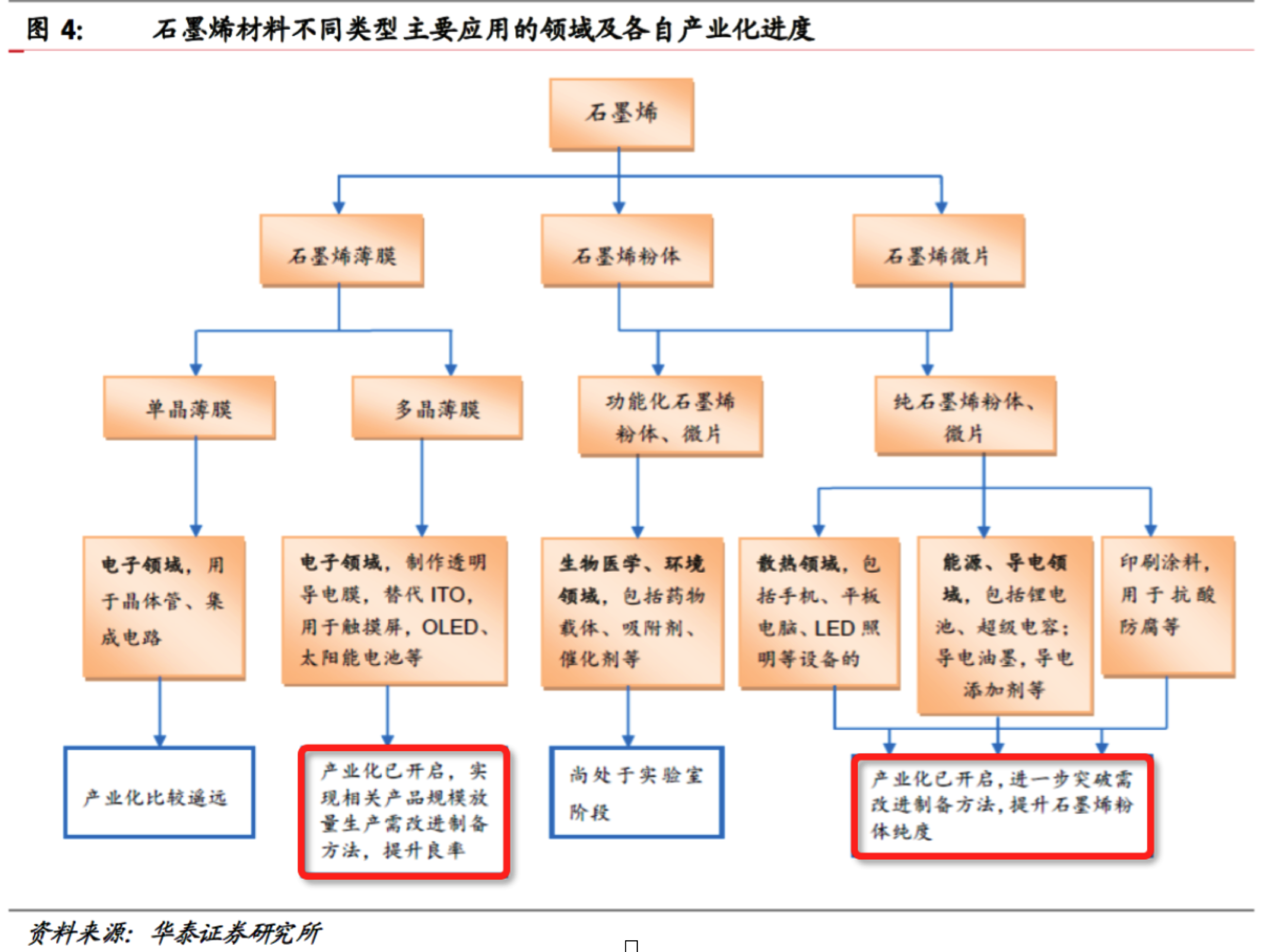 目前石墨烯材料分为两类,一类是由单层或多层石墨烯构成的薄膜,另一种是由多层石墨烯构成的微片。石墨烯薄膜又分为单晶薄膜和多晶薄膜。其中单晶薄膜可以用于集成电路等电子领域,但是产业化尚待时日。而多晶薄膜有望在5-10年内实现产业化应用,用于制造触摸屏(特别是柔性制造屏)和其他需要透明电极的领域。除了纯石墨烯之外,另外还有很多石墨烯衍生物,未来也会有较为广泛的应用。