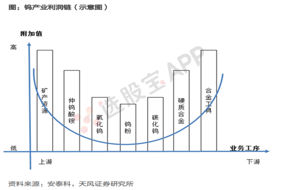 钨产业利润链是一个典型的“微笑曲线”产业链,即钨产品的利润呈现两端高,中间低的现象。上游钨精矿的毛利率可以达到40%,而中间冶炼产品APT、钨粉和碳化钨粉的毛利率在15%~30%之间,下游产品硬质合金的毛利率为40%左右。