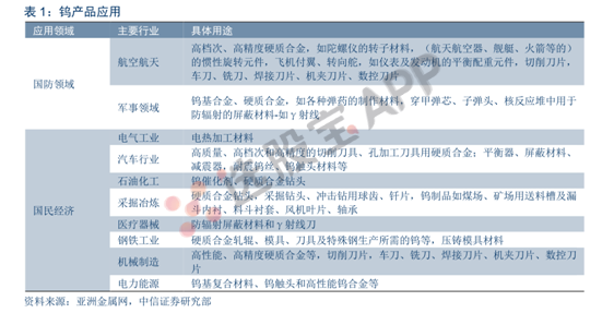 钨用途广泛,主要应用于金属加工、机械、电子、矿业、重型制造业、石油化工等领域,应用达到总消费量的 85%;军事、核能和航空航天工业等应用占 15%,其中钨在工业上的主要用途为生产硬质合金材料和钨铁。