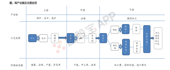钨产业链:钨产业从原矿开采直至最终应用产品的产业链分三个阶段,上游的钨矿开采、中游冶炼、下游深加工。