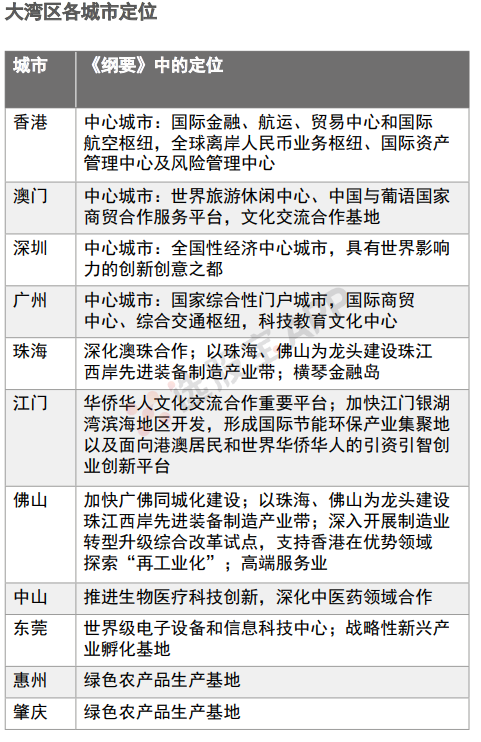 2019年2月18日,中共中央、国务院印发了《粤港澳大湾区发展规划纲要》,标志着大湾区发展新的里程碑。《纲要》全文十一章56页,提出了大湾区的主要发展目标,即到2035年,将大湾区发展成为“高质量发展的典范”。《纲要》提出,大湾区的发展目标是,通过开放和内部互联互通,构建结构科学、集约高效的大湾区发展格局;在此指导思想下,通过结构性改革和创新驱动发展将大湾区建设成为富有活力和国际竞争力的一流湾区和世界级城市群。《纲要》显示,四个领域将迎来突破性发展:(一)科技创新;(二)进一步市场开放;(三)基础设施升级改造,既包括铁路、桥梁等交通运输基础实施,也包括系统和信息等基础设施;以及(四)人才和资本流动。