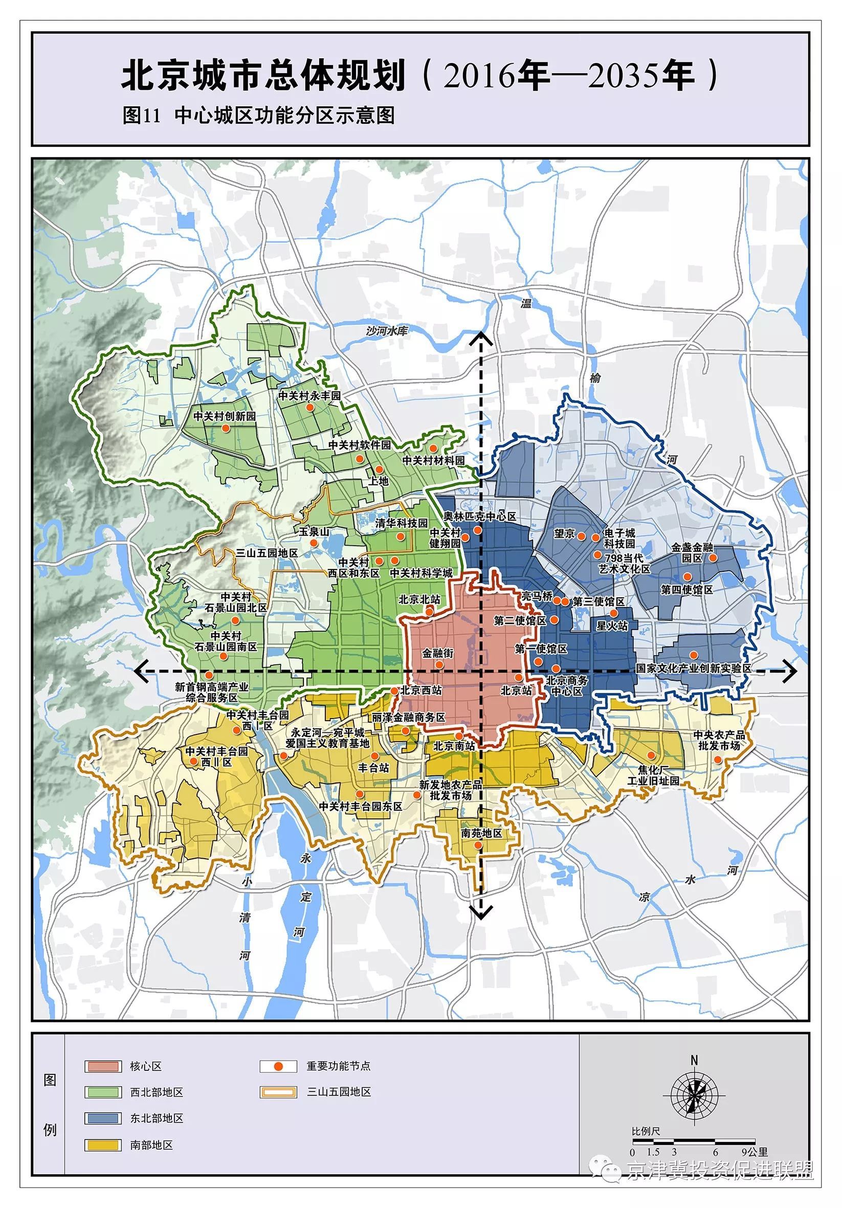 以两轴为统领,围绕核心区,在西北部地区、东北部地区、南部地区形成主体功能、混合用地的空间布局,保障和服务首都功能优化提升。
