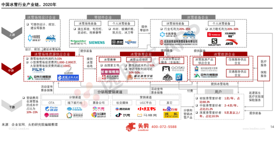 中国冰雪行业产业链上游环节主体为冰雪装备零部件与冰雪装备供应企业,中游环节参与者为冰雪场地资源供应企业、冰雪体育企业、冰雪旅游企业等,下游环节主体是冰雪产品分销与营销渠道、用户。
