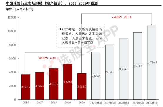 在政策利好、居民消费能力增强、技术不断进步等因素驱动下,中国冰雪行业加速向好发展,行业市场规模将持续扩大,预计2025年将达到10,780.8亿元。