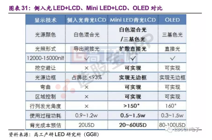 (5)Mini LED比Micro LED良率高,也具备省电、薄、寿命长等等特点。相比MicroLED,Mini LED技术难度更低,更容易实现量产,成本还在不断下降,性价比甚佳(每年Mini LED背光显示器成本将以15~20%的幅度下降,在2022年将有机会低于OLED显示器)。