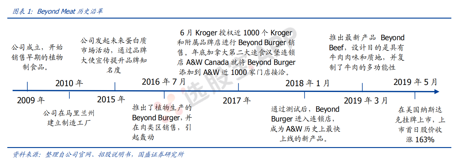 美国首家“人造肉”上市公司,上市首日股价大涨。Beyond Meat 是美国一家生产和销售素食肉类的公司,利用大豆、豌豆等植物蛋白为原料制作形成类似肉的组织口感的素食肉类,也就是所谓的“人造肉”。Beyond Meat 于 2009 年创立于美国加州,以直接从植物生产肉类产品为愿景,最初主要生产冷冻鸡肉和香肠的素食替代品,2010 年在马里兰州建立制造工厂,公司 2016 年 7 月推出了素食汉堡 Beyond Burger,无论是在外观、烹饪方式还是口味上,都和真正的牛肉汉堡接近,已成为公司的标志性产品;2017 年至今,公司与多家主流零售、餐饮商进行合作,如 A&W (Canada)、Kroger、Bareburger、BurgerFi 等,其中 Beyond Burger 成为 A&W 历史上最快上线的新产品。2019 年 5 月 1日公司在美国纳斯达克挂牌上市,上市首日股价收涨 163%,募集资金 2.19 亿美元。