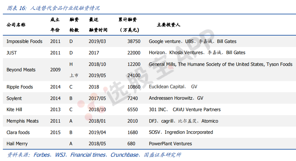 2018 年农产品技术投资额创历年新高,据 AgFunder 报告,农产品技术创新公司 2018年全年筹资总额达 169 亿美元,同比增长 43%。具体到素食或人造替代食品领域,相关公司 18 年融资活动开展也颇为频繁,其中 Impossible Foods 18 年四月发行 1.14 亿美元可转债,累计融资额度保持行业领先,新加坡淡马锡控股和香港的帆船资本成为公司新晋投资人。该领域聚集了李嘉诚、比尔盖茨等商界大佬,同时也吸引了 Tyson Foods、General Mills 等食品产业链巨头。