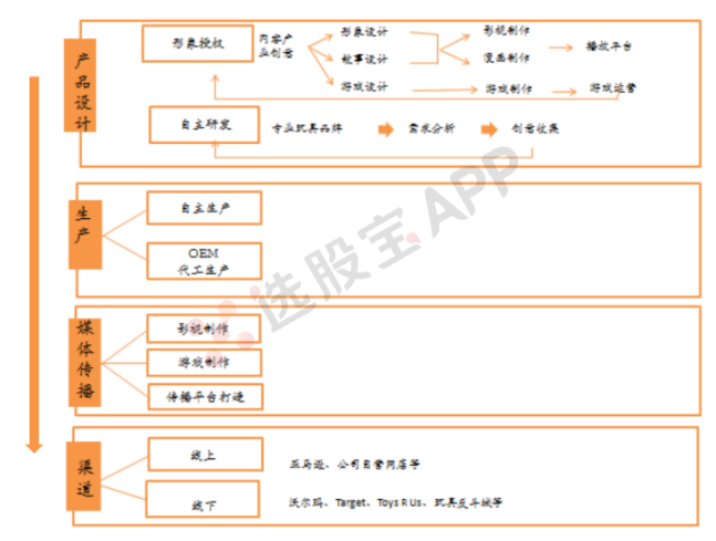 发达国家玩具依靠“品牌+渠道”的成熟商业模式占据了玩具产业链的高附加值环节,行业集中度高,大品牌玩具企业占据较大市场份额;我国玩具行业出口量大,但总体呈现产业大而不强,企业小而散的特征。但是我国玩具行业已经开始往运营IP方向发展。