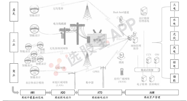 智能电网四大领域分别是AMI(AdvancedMetering Infrastructure)高级计量基础设施、ADO(Advanced Distribution Operation)高级配电运行、ATO(Advanced Transmission Operation)高级输电运行和AAM(Advanced Asset Management)高级资产管理。市场用户信息的智能计量与交互是增强电力分配及增值服务科学合理性的重要基础,也是为上游输电乃至综合管理的整体协调性提供实时的下游市场数据,因此AMI升级是电网智能化水平提升的重要前期内容。