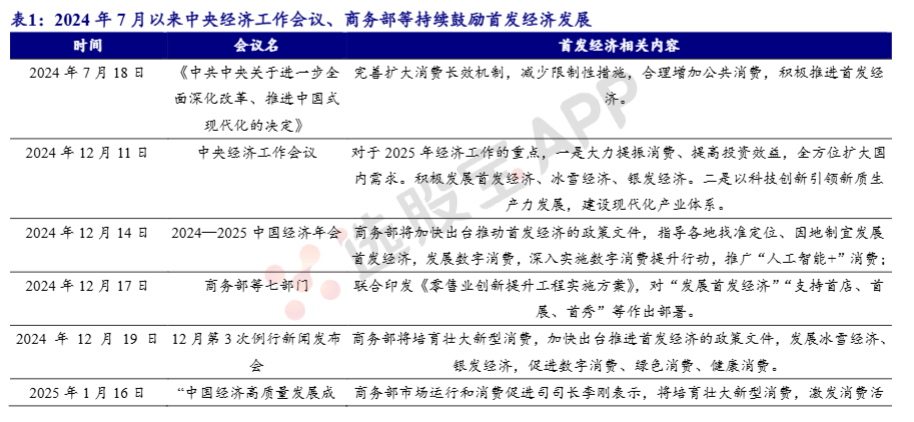 2024年7月以来,《中共中央关于进一步全面深化改革、推进中国式现代化的决定》强调“积极推进首发经济”,随后在2024年12月的中央经济工作会议确定的2025年重点任务中包含“大力提振消费”“积极发展首发经济”,同月的例行新闻发布会上商务部表示将加快出台推进首发经济的政策文件,2025年1月商务部于新闻发布会上表示将指导各地因地制宜发展首发经济,政策大力支持或持续助力首演、首秀、首展等首发经济发展提速。