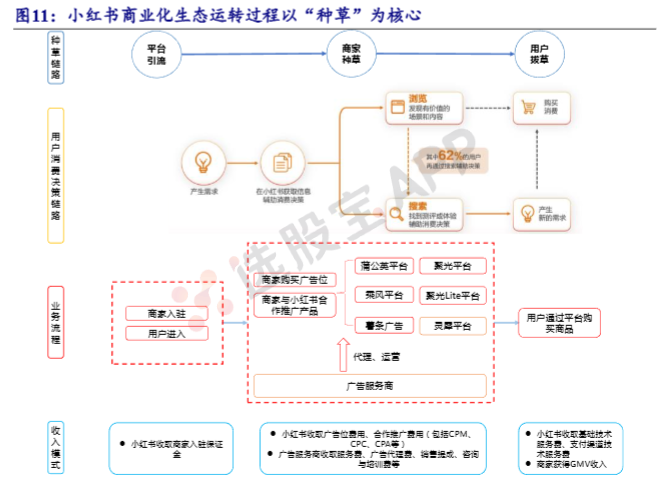 小红书商业化生态运转核心为“种草”。小红书平台先通过高质量UGC内容吸引商家和用户入驻,在商家端收取入驻保证金,随后平台在商家种草环节通过广告收入变现,主要业务为商家购买广告位/与小红书合作推广产品,小红书为商家提供蒲公英平台、聚光平台、薯条广告等广告产品,广告服务商则为品牌商家提供广告代理、运营等服务。在收费模式上,小红书会根据CPM、CPC、CPA指标收取广告位费用/合作推广费用,广告服务商则收取服务费、广告代理费、销售提成(后佣)、咨询与培训费等。在用户拔草环节,用户通过平台购买商品,商家获得GMV收入,小红书则按比例收取基础技术服务费和支付渠道技术服务费,由此小红书通过高质量内容吸引用户留存,并通过广告、电商两种模式变现,从而打通商业化生态。